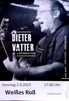 Muss es auch, denn plötzlich sind Themen wieder brandaktuell, die man schon in der Mottenkiste der Geschichte wähnte. Da trifft es sich gut, dass Dieter Vatter schon immer ein politischer Singer Songwriter war und geblieben ist. Seine markante Stimme ist fordernd, eindringlich, kratzbürstig und rauh – aber auch voller Zärtlichkeit, Sehnsucht und Poesie. Seine Texte, mit einem Schuss Melancholie und bittersüßer Ironie den Blick auf das Hier und Jetzt gerichtet, haben nichts an Brisanz verloren. Seine klaren Worte gegen Neo-Nazis, Jung- und Alt-Faschisten und den Alltagsrassismus sind heute wichtiger denn je. Für eine klare Botschaft braucht es dann auch nicht mehr als seine Stimme und eine Gitarre.